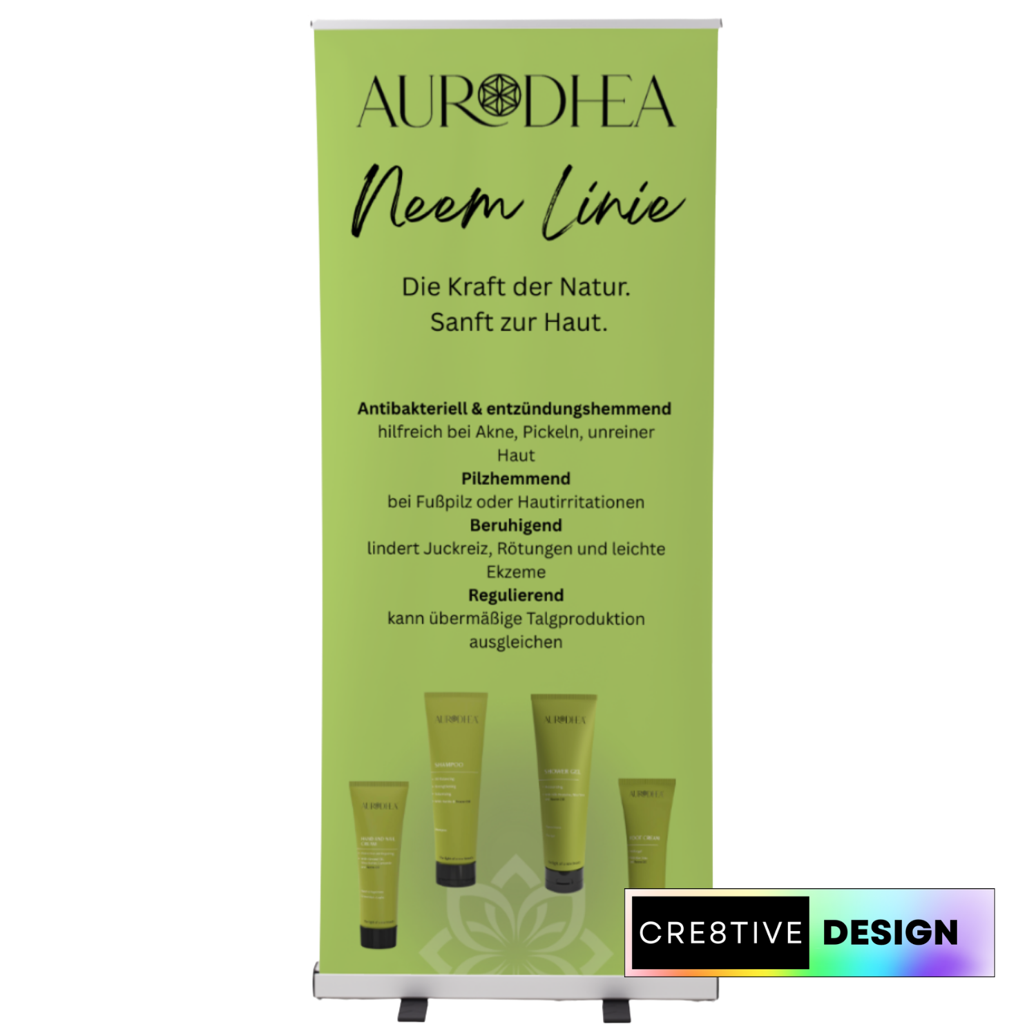 Das Roll-Up Banner „Neemöl – Die Kraft der Natur. Sanft zur Haut.“ stellt einen der wirkungsvollsten pflanzlichen Inhaltsstoffe für natürliche Hautpflege in den Mittelpunkt. Die klare, vertrauensvolle Gestaltung mit mehreren Produkten vermittelt Kompetenz, Natürlichkeit und ganzheitliche Pflege.