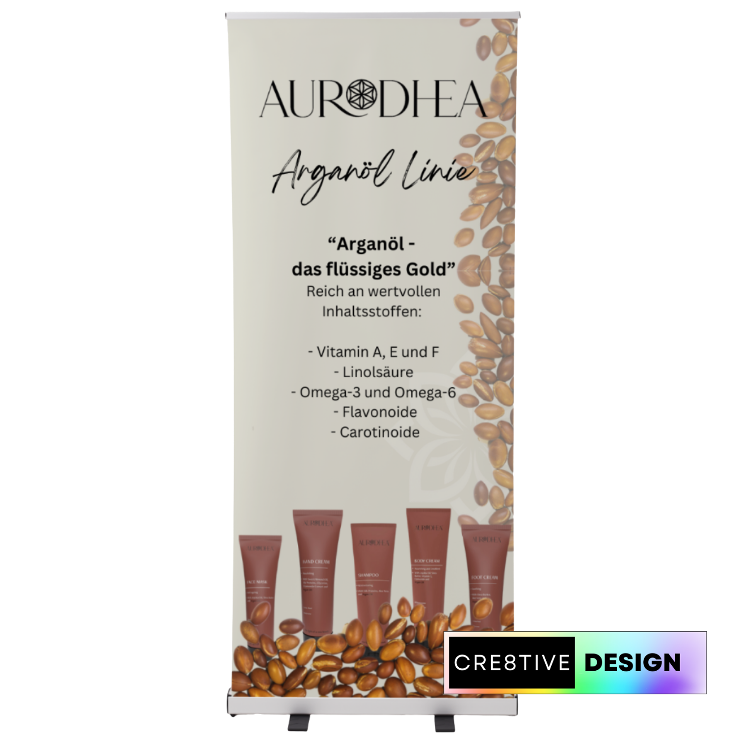 Das Roll-Up Banner „Aurodhea Arganöl Line“ präsentiert hochwertige Pflegeprodukte rund um eines der wertvollsten Naturöle der Welt – Arganöl, das flüssige Gold. Die harmonische Darstellung mehrerer Produkte vermittelt Natürlichkeit, Qualität und luxuriöse Pflege auf den ersten Blick.