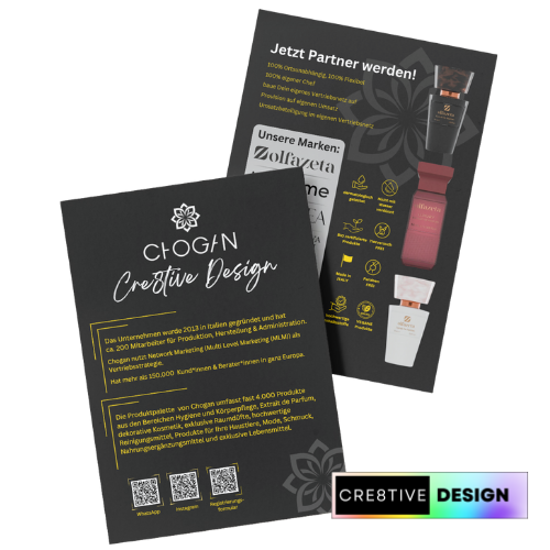 Auf der Rückseite werden die Markenwelt von Chogan übersichtlich dargestellt und zugleich ein attraktiver Hinweis platziert, der Interessenten über die Möglichkeit informiert, selbst Chogan-Partner zu werden. So verbinden Sie professionelle Unternehmenspräsentation mit aktivem Netzwerk-Marketing. Das verwendete 170 g glänzende Papier sorgt für eine hochwertige Haptik und Druckwirkung, die Ihre Botschaft visuell und haptisch unterstützt – ideal für Kundengespräche, Veranstaltungen oder als Beilage zu Bestellungen.