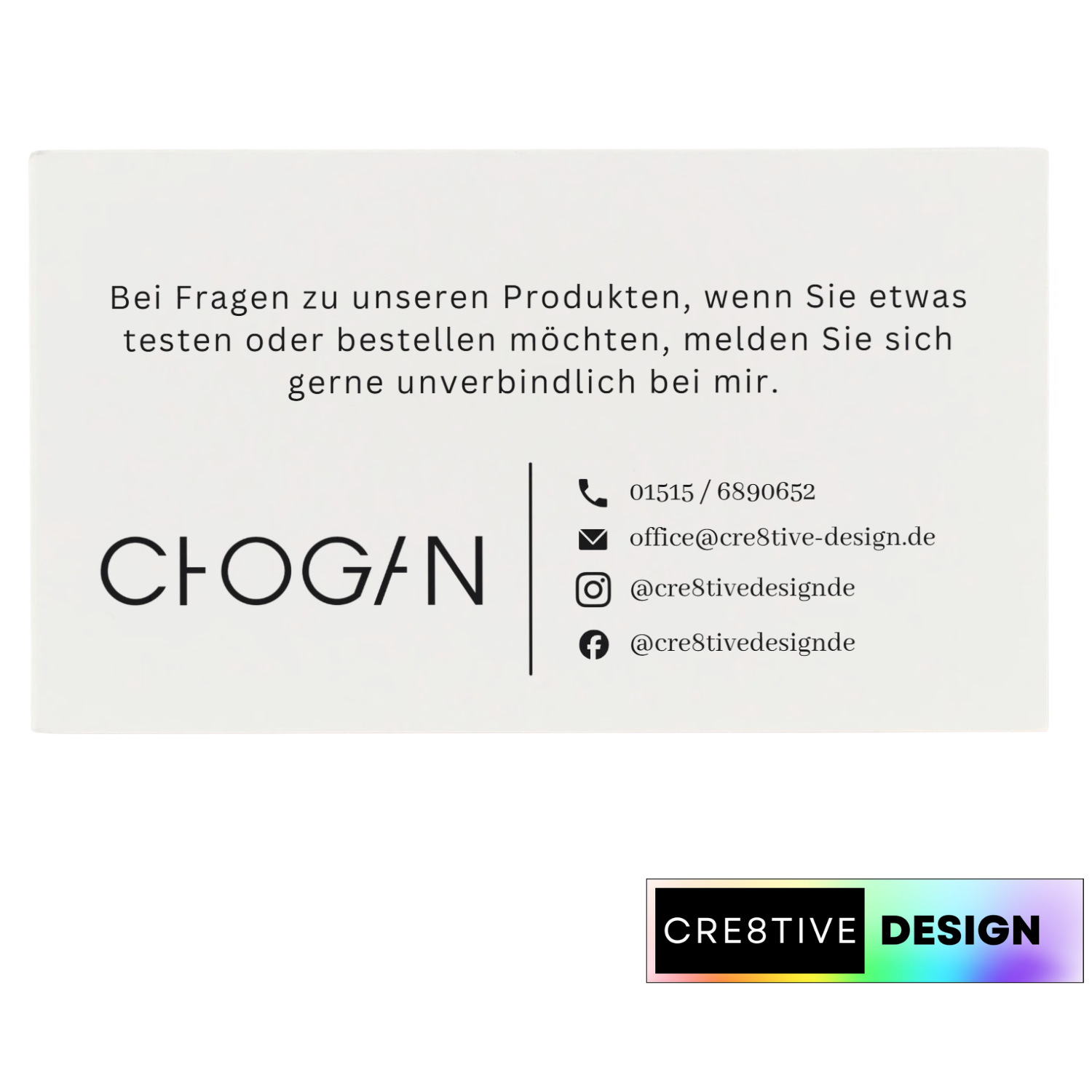 Das minimalistische Design mit grafischen Elementen und Logo-Akzenten schafft eine starke Markenwirkung, ohne überladen zu wirken. Die Vorder- und Rückseite sind klar strukturiert und bieten ausreichend Platz für Kontaktdaten, Social-Media-Profile und Hinweise auf Ihre Chogan-Produkte.