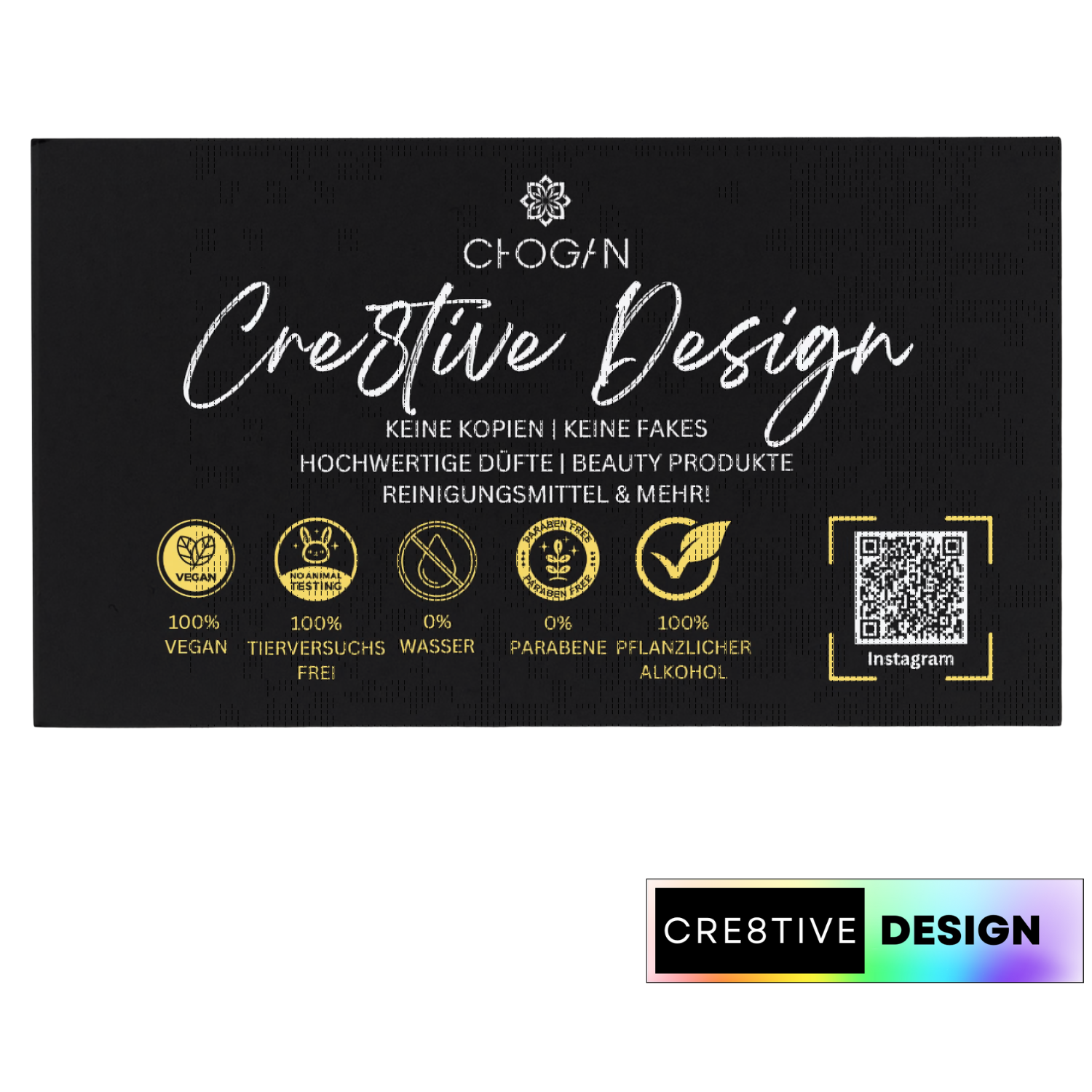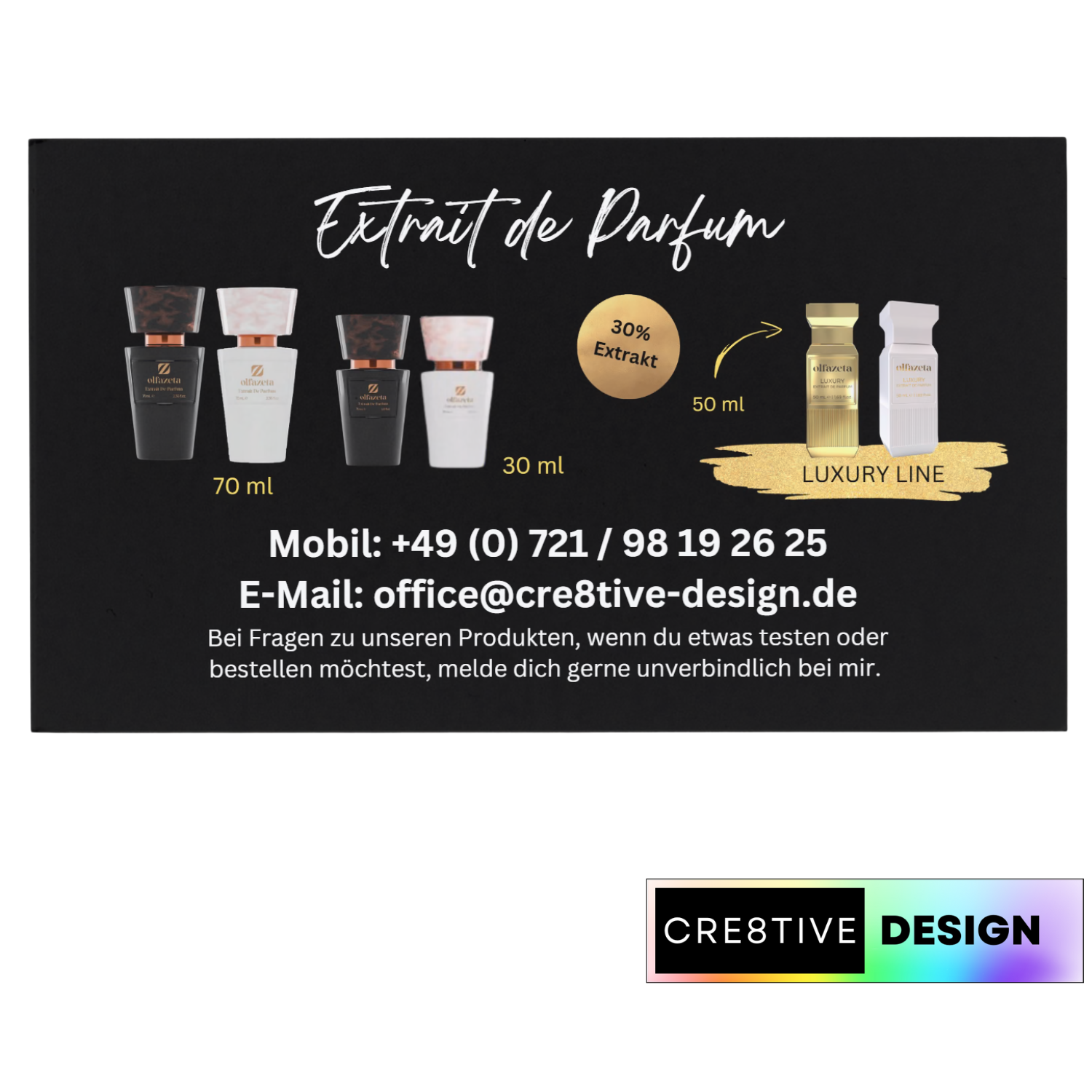 Die Kombination aus Schwarz und Gold unterstreicht den luxuriösen Charakter der Marke und lenkt den Fokus gezielt auf hochwertige Duft-, Beauty- und Lifestyle-Produkte. Grafische Elemente, Produkthighlights und Qualitäts-Icons (vegan, tierversuchsfrei, parabenfrei etc.) machen die Visitenkarte zugleich informativ und verkaufsstark.